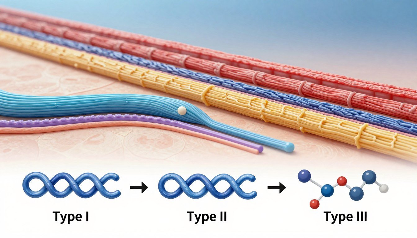 膠原蛋白種類主要分為五種類型。第一型膠原蛋白最常見,佔身體膠原蛋白的90%,存在於皮膚和骨骼中。第二型膠原蛋白主要位於軟骨。第三型膠原蛋白支撐血管和器官。